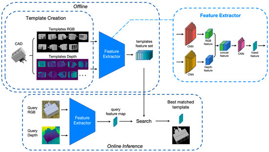The inference process of the entire framework can be divided into two parts: offline and online, as illustrated in Figure 2. The offline part encompasses template rendering and feature extraction, with the goal of constructing a template library and a feature repository for the objects to be detected. The template set was generated offline using a CAD model, which is elaborated in Section 3.2. The online part involves feature extraction from data collected in real time, as well as performing similarity retrieval against the template feature set to ascertain the best-matching pose.