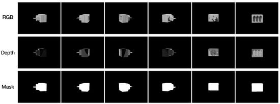 We followed a similar approach as used in refs. [9,11], where a polyhedron was created with 602 viewpoints and 36 plane rotations at 10-degree intervals. By combining different viewpoints and plane rotations, we generated a total of 21,672 viewpoints for each object. We utilized BlenderProc [39] for high-fidelity rendering to obtain RGB projections, depth maps, and masks from various viewpoints. In the end, we rendered 1806 images as a template library of individual objects. Figure 4 shows how a single object would be rendered from several perspectives. This strategy allows for a comprehensive set of templates to cover a wide range of object poses and rotations, which is beneficial for accurate pose estimation.