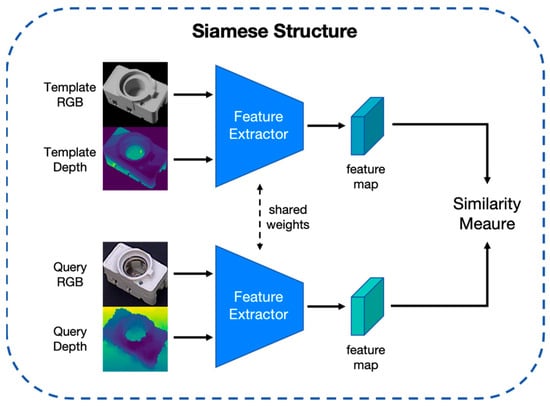 An analysis of real-world industrial scenarios and previous research results prompted us to design a novel template matching approach that leverages multiple types of data. We constructed a template set comprising predefined pose parameters, encompassing both RGB images and depth maps, generated with high-fidelity rendering using CAD models. Subsequently, we employed a dual-channel feature extractor to obtain fused features from RGB and depth data, followed by training using a Siamese network structure. Finally, by computing the similarity between features, we identified the template that best matched the real-world scene, enabling us to estimate the object’s pose, as illustrated in Figure 1. To facilitate visualization, the depth map is displayed in pseudo-color format.