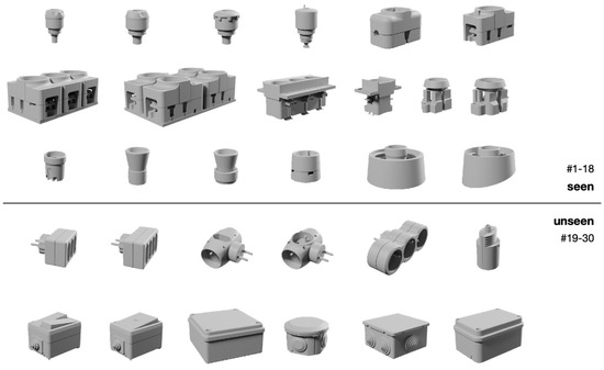Dataset. We employed the T-LESS [42] dataset for our evaluation, as it contains 30 industry-relevant objects that lack significant texture or discriminative color. To assess the robustness of our model on unseen objects, we followed the evaluation criteria outlined in [9,11,26]. Specifically, we used objects 1–18 for training and reserved objects 19–30 as unseen objects to validate the model’s generalization capability. The diversity in object shapes is illustrated in Figure 6, and there is a substantial visual contrast between seen and unseen objects.