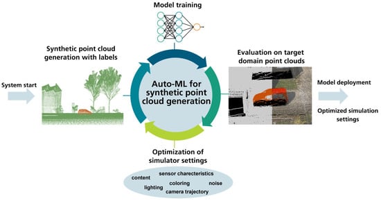 Our system is based on an existing machine learning pipeline for semantic segmentation (Figure 1, step of model training) and extended with self-developed Auto-ML functionalities and communication interfaces (Figure 1, steps of: evaluation on target domain point clouds, optimization of simulator settings and synthetic point cloud generation with labels).