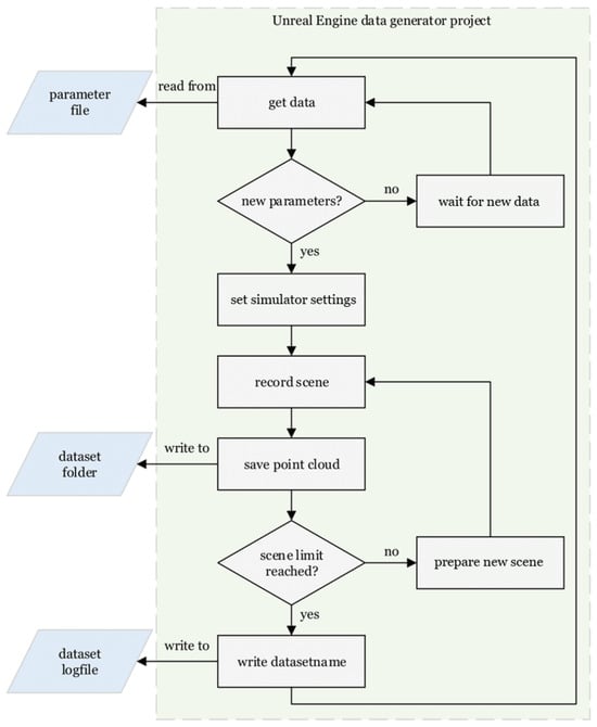 Figure 2 shows the workflow of the Unreal Engine data generator. At system startup, the parameter file contains random or preset domain parameters. The parameter file is frequently checked by an Unreal Engine data generator process. When the process reads new parameters, the simulator settings are set accordingly and the synthetic data generation begins. For point cloud generation, Unreal Engine provides simulated sensors such as LiDAR, radar and ultrasound for sensor data in modelled scenes. With the LiDAR point cloud plugin [24], it becomes a powerful tool for importing, editing, and saving point clouds to create custom synthetic point cloud data for machine learning. When a scene is processed, the point cloud is saved to an external dataset folder. Upon reaching a scene limit, an Unreal Engine process writes the name of the generated dataset to an external dataset logfile.