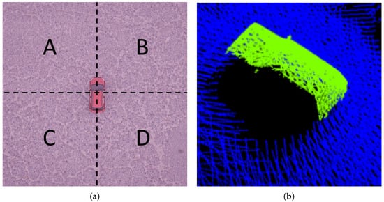 Angular Loss parameter. (a) Angular Loss space declaration. Division of the synthetic environment into quadrants A–D, with origin in the center of the car. One to three sectors are blocked if parameter is set to on; (b) Occuring shadow effects of setting Angular Loss to on.
