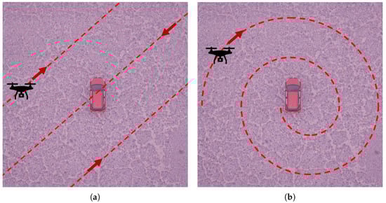 Visualization of the implemented Camera Trajectory settings. The red dashed lines and the arrows indicate the trajectory of the camera. (a) Camera with grid trajectory; (b) Camera with spiral trajectory.