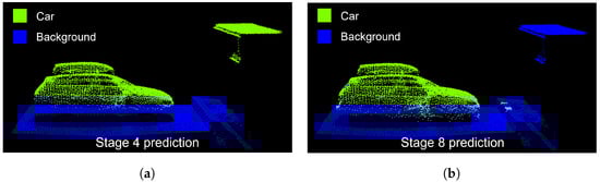 Prediction of models trained with different synthetic training data on a Hessigheim3D test scene. The incorrectly labeled roof part in the stage 4 prediction leads to a poor recognition result. (a) Model trained with synthetic data generated with setting from stage 4. Car-IoU: 0.542; (b) Model trained with synthetic data generated with setting from stage 8. Car-IoU: 0.936.