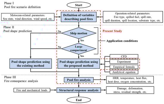 The procedure for analysing the effects of spilled liquid fuel on structures in large compartments under motion is illustrated in Figure 2. This procedure can be divided into four phases. In Phase I, the pool fire scenario is defined by determining the condition under which the spillage occurs. In Phase II, the pool shape, which represents the outline of the spilled flammable liquid spreading extent, is predicted based on the conditions defined in the previous phase. For scenarios where the ship or offshore installation is subjected to motion and the spillage occurs in a large compartment that extends to a substantial length of a ship or offshore installation (e.g., ro-ro space, hanger deck, etc.), the proposed method which considers substrate inclination is used. Otherwise, existing methods which do not consider the inclination of large compartments can be used. In Phase III, fire consequence analysis is conducted through pool fire analyses and structural response analyses.