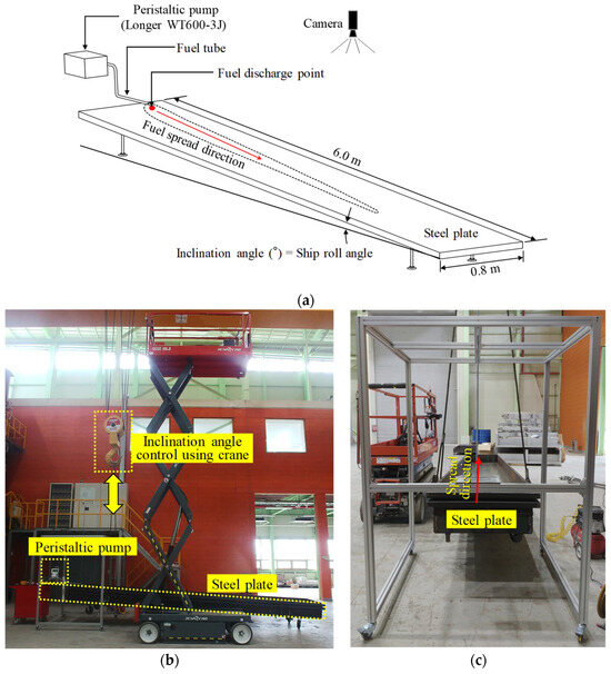 Fuel discharge experiment setup: (a) schematic layout, (b) test layout, (c) steel plate (ship’s deck).