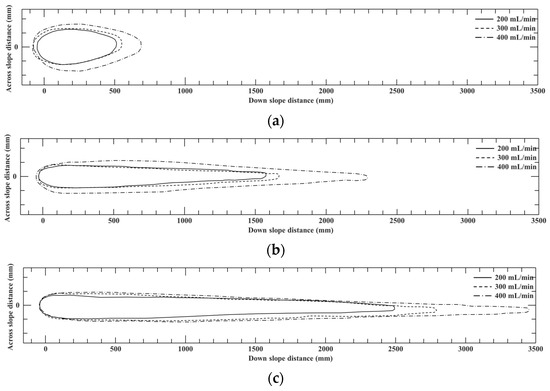 Figure 5 shows the outlines of the experimentally measured pools 30 s after the start of fuel discharge for each experiment. The pool spread from left to right, with the fuel discharge point as the origin. Figure 5a displays the outline of the spilled pool on a 1°-inclined substrate. Higher discharge rates resulted in a larger pool length, breadth, and area. The maximum pool length and breadth were 691.7 mm and 351.4 mm, respectively. Figure 5b shows the pool shapes on the 5°-inclined substrate. For each discharge rate, the pool lengths were longer and the breadths shorter than those of the 1° inclination case (see Figure 5a). Figure 5c shows the pool outlines for the 10°-inclined substrate. Similarly, higher discharge rates resulted in larger pools in terms of length, breadth, and area. Furthermore, longer pool lengths and shorter breadths were measured compared with the cases with lower inclination angles.