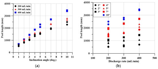 Figure 7 illustrates the effects of the inclination angle and discharge rate on the pool shape using the experimental measurements at . Figure 7a,b show the influence of the substrate inclination angle and discharge rate on the pool length, respectively. Near-linear relationships between the pool length and both the inclination angle and discharge rate was found. Furthermore, as already seen in Figure 6, the pool length was more affected by the inclination angle. Similarly, the pool breadth is plotted in Figure 7c,d. The breadth decreases with larger inclination angle and increases for higher discharge rates, except for the inclination angle of 7°. It is thought that the condition of the surface affected the measurements. Furthermore, the experimental results were inconsistent with the findings of Ingason and Li [21], in that in this study, the pool breadth was dependent on the discharge rate and the inclination angle. This inconsistency is due to the fundamental difference in the experimental setups. Ingason and Li [21] investigated the spilled pool shape in narrow tunnels, where the spilled fuel was spilled until it reached drainage gutters at the roadside. In contrast, the present study considered large compartments which do not physically confine the spilled pool, and the pool breadth was measured as it spread. The difference in the pool breadth definition caused disagreement between the results. Figure 7e,f show the relationship between the pool area, inclination angle, and discharge rate. The pool area increased in a predictable manner until the 4°-inclined cases, with the cases under larger inclination angles displaying a lower increment in area. Furthermore, higher discharge rates resulted in larger pool areas, and with a few exceptions higher inclination angles resulted in larger areas, regardless of the discharge rate.