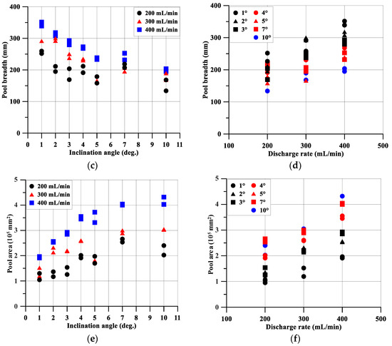 Experimentally measured pool dimensions (): (a) length with respect to inclination angle; (b) length with respect to discharge rate; (c) breadth with respect to inclination angle; (d) breadth with respect to discharge rate; (e) area with respect to inclination angle; (f) area with respect to discharge rate.