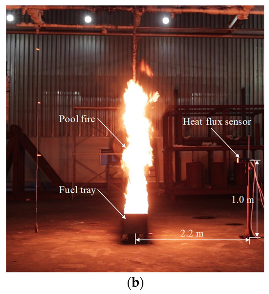 Pool fire experiment setup: (a) schematic layout, (b) actual layout.