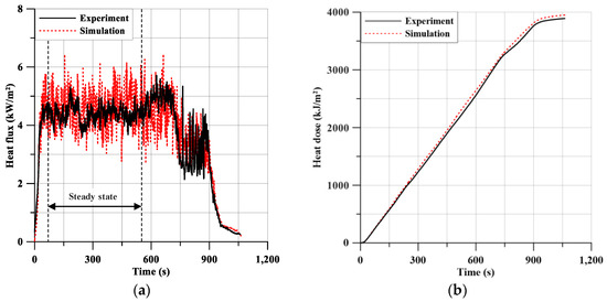 Comparison of the experimental data and simulation results: (a) heat flux, (b) heat dose.