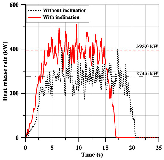 Once the pool surface areas were estimated, the HRR and duration of the pool fires could be calculated. The HRR was calculated using Equation (4), as explained above. The material properties in Table 2 were substituted into the equation. The estimated HRR and fire duration values for the scenarios without and with inclination are presented in Table 7. The HRR estimated using the proposed empirical formula was 36.0% higher than the estimation obtained using the formula proposed by Grimaz et al. [18]. The increase in HRR for pool fires on an inclined substrate was due to the larger pool area, which also resulted in a shorter fire duration, as the same amount of fuel was spilled for all of the scenarios.
