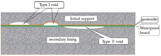Voids behind the tunnel lining can be divided into two categories based on their positional relationship to the flashing: The voids between the initial support and the waterproof board are type I voids, such as the voids caused by an uneven excavation contour surface or primary support surface, insufficient margin of the waterproof layer, etc. The voids located between the secondary lining and the waterproof board are type II voids, such as voids caused by poor workability of the concrete, excessive density of steel bars in the lining, insufficient pumping pressure, dry shrinkage of concrete, etc., as shown in Figure 1.