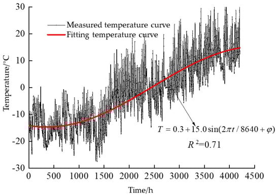 In this study, the temperature field monitoring of high-speed railway tunnels in cold areas was carried out based on the Harbin–Mudanjiang high-speed railway, and the Hufengling Tunnel and Zhishan Tunnel, which have the highest altitude on the line, were selected for monitoring. In previous studies, the sine function with an annual cycle has been widely used to express tunnel temperature changes and has been used as a temperature load or boundary condition in model tests and numerical simulations, such as in the Hongfu Tunnel [] and Galongla Tunnel [], all using the temperature load function in the form of Equation (1):