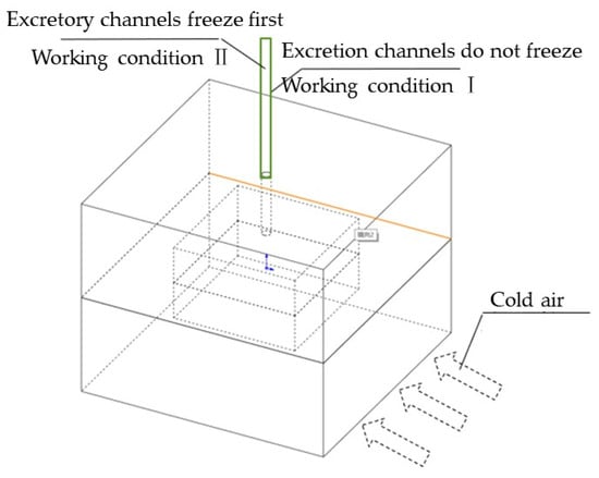 We set the test conditions according to the tunnel void form as follows: Working condition 1: during the freezing process of type I voids, the water supply and discharge channels do not freeze. Working condition 2: during the freezing process of type II voids, the water supply and drainage channels are frozen first, and the water body in the model freezes later, as shown in Figure 4.