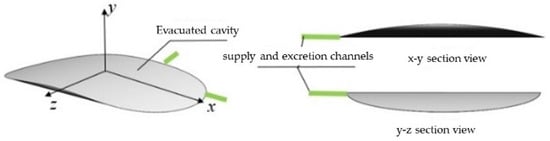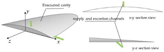 Based on the supply and discharge conditions of groundwater, two working conditions (top channel and lateral channel) were designed. In Figure 5 and Figure 6, the left side shows the shape of the hollow cavity, while the right side shows the location of the supply and excretion channels. In the x–y cross-sectional view in Figure 5, the drainage channel is located at the top of the hollow cavity, which corresponds to the working conditions in which water seeps into the cavity after the waterproof panel on the tunnel vault is damaged; in the y–z cross-section in Figure 5 and Figure 6, the drainage channel is located on the side of the cavity, corresponding to the tunnel arch waist and other parts. Water seepage enters the vault cavity along the waterproof board.