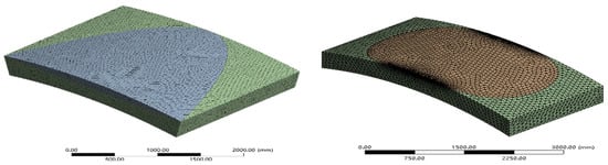 In order to reduce the calculation required by the model, the concrete- and water-filled cavities within the void range of the vault were selected as the research objects. The longitudinal length of the circular wedge-shaped voids and flying-saucer-shaped voids was 2.0 m, and the maximum height of the voids was 20 cm. A grid of the model is shown in Figure 7, and the parameters selected for simulation are shown in Table 1.