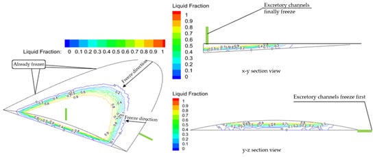 It can be seen from Figure 9 that the freezing process of the void water behind the lining also starts from the edge of the void and develops from its thinnest part to the thickest part; during the freezing process, the freezing of the void water takes place at the side of the void (x–y cross-sectional view), and the excretory channels at the top (y–z cross-section view) are frozen first.