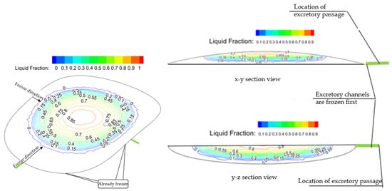 It can be seen from Figure 8 that, during the cooling process, the freezing of the void water behind the lining starts from the edge of the void and develops from its thinnest part to the thickest part; during the freezing process, the freezing of the void water begins at the side of the void. The excretory channels (y–z cross-section) freeze first, and the channels at the top of the void freeze last (x–y cross-section).