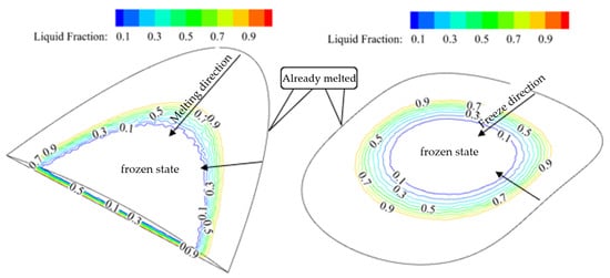 Under short-period temperature fluctuation conditions, when a positive temperature occurs in the lining structure, the ice formed starts to melt from the thinnest part, and then develops to the thickest part. This is the same as the freezing development process—that is, the ice that freezes first when cooling is also the first to melt when the temperature rises, as shown in Figure 10.