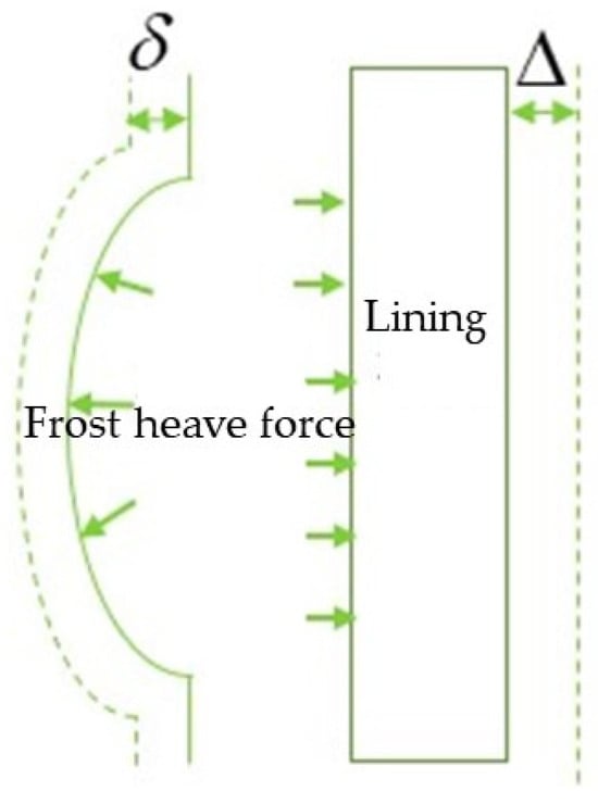 Some scholars have conducted research on the frost-heave force of the local water storage space around tunnels []. Based on the cavity caused by the uneven early excavation surface of the tunnel, a frost-heave force calculation model considering the elastic resistance of the lining has been proposed. On this basis, Fan Lei [] modified and re-derived the original local water frost-heave model by considering the elastic resistance of ice body deformation, using three series of springs to simulate the cavity deformation after the frost-heave force was generated. At the same time, the surrounding rock and the deformation coordination conditions for the simultaneous displacement of the lining structure were used to derive the frost-heave force calculation formula.