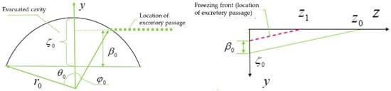 When there is a groundwater drainage channel in the cavity, part of the groundwater is extruded and discharged during the frost-heave process of the water body in the cavity, and then the drainage channel is frozen and the remaining water body freezes and heaves to generate frost-heave force. The volume of discharged water is mainly related to the location of the drainage channel and the shape of the cavity. The frost-heave force when there is a drainage channel was analyzed using a circular wedge-shaped cavity. As shown in Figure 14, the height of the emptying cavity was , and the drainage channel was located in the range of 0~. The water body froze from the bottom of the cavity. As the freezing front moved upward, the drainage channel was frozen, and the water body in the cavity could not be drained, resulting in the generation of frost-heave force.