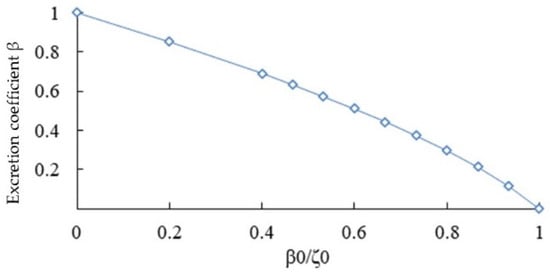 when = 0—that is, when the volume of water discharged during the freezing process is 0—the frost-heave force . When , the volume of discharged water is equal to the volume of water expanded when freezing, and the frost-heave force . The values of the excretion channel at different cavity heights can be obtained. During actual engineering use, the value can be determined by referring to the relative position of the excretion channel and the emptying cavity, as shown in Table 3. The graph of the relationship between the excretion coefficient and the excretion channel position is shown in Figure 15.