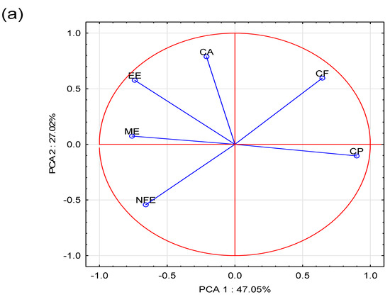 Biplot based on first two principal component axes for nutritional value and metabolic energy of dog foods (a) and distribution of 20 commercial dog foods based on the first two components obtained from principal component analysis (b) (DM—dry matter; CP—crude protein; EE—ether extract; CF—crude fiber; CA—crude ash; NFE—nitrogen free extract; ME—metabolizable energy; A—food for adults dogs; P—food for puppies and growing dogs; GI—grain included; and GF—grain-free).