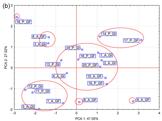 Within the puppy dog foods, only fourteen pairs of dog foods showed similarity (rc > 0.3) and eight showed dissimilarity (rc < 0.3). The remaining 23 coefficients confirmed the lack of similarity of the compared pairs of dog foods. Somewhat surprisingly, the dog foods 14_P_GI and 17_P_GF exhibited a high similarity in their composition profiles (rc = 0.832), as evident in the PCA analysis, which located these dog foods in the first quadrant of the coordinate system (Table 2). Despite their significant difference in composition (GI/GF), both dog foods had a higher CF content (Figure 1).