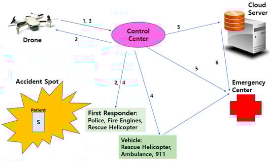 Ref. [] covered secure medical records in on-road emergencies. However, emergencies often occur not only on-road but also off-road. In other words, numerous incidents, such as a vehicles rolling down a cliff or a natural disaster on a beach, often occur in places where vehicles cannot approach. In preparation for this situation, we propose a security system in which drones participate by assuming the following specific accident scenarios:
