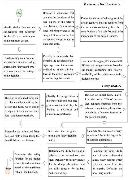 Conclusively, it is not an overstatement to say that concept selection in the preliminary design phase of a product is very important, and as such, more emphasis and effort needs to be put into the design concept selection in order to have a robust decision process. This is necessary because it provides more information on the design features associated with the optimal design concept. Sometimes, modifications can be made to any of the alternatives or the optimal design in order to accommodate some design features before fabrication commences. Due to the importance that is attached to the concept selection process, this article proposes the adoption of fuzzy MARCOS as a multicriteria decision model as a tool for carrying out the concept selection process. The preliminary decision matrix was developed considering the weights of the design features and sub-features and the availability of the sub-features in each of the design concepts. The essence of considering the availability of the sub-features in the alternative designs is to assists the decision process in obtaining unambiguous values for the performance of the design alternatives in the form of linguistic terms using several experts’ opinion. The framework for applying the fuzzy MARCOS model to the selection of the optimal conceptual design was developed based on its application to other subject areas, and the model performed excellently by identifying the optimal design concepts considering its overall utility value relative to the best and worst design. Further work can also be carried out in the aspect of identifying the designs features to be improved on considering the best and worst design concepts identified by the fuzzy MARCOS model.
