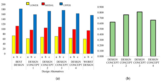 In Equation (24), , , and represent the crisp values for , , and , respectively. The design concepts are ranked according to the values of the overall utility functions such that the design with the highest value is the optimal design.