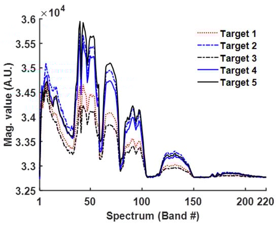 A wavelet-feature correlation ratio Markov clustering algorithm (WFCRMCA) is proposed to differentiate the pixels according to the spectrum similarity among pixels. Of course, the spectrums of one object under different conditions are different. Still, they have the same features (up, down, protruding, concave, see Figure 1) at the same spectral positions, which are the main parameters used to evaluate the difference among remotely sensed pixels [,]. Therefore, these characteristic positions can denote class features. Fortunately, band-pass wavelet filters can decompose data at different scales to detect these characteristics.