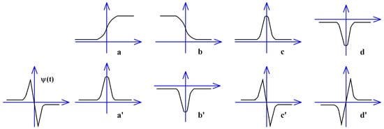 The wavelet band-pass filter and four kinds of abrupt signals. (a–d) are the four critical signals: upward-maximal point, downward-minimal point, protruding crossing zero point, and concave crossing zero point. ψ(t) is the band-pass wavelet filter, (a’–d’) are the output of the four signals through the wavelet filter.