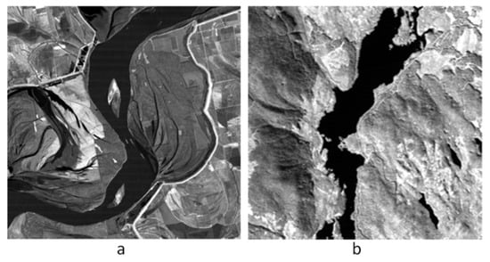 For Mississippi (Figure 5a, 512 512, 8 bit []) TM multi-spectral images, the sixth band heavily affected by the atmosphere is crossed out. The other 6 bands are expanded to 39: original data, 1–6; second-order auto-correlated bands, 7–12; second-order cross-correlated bands, 13–27; square root function, 28–33; and logarithmic function, 34–39.