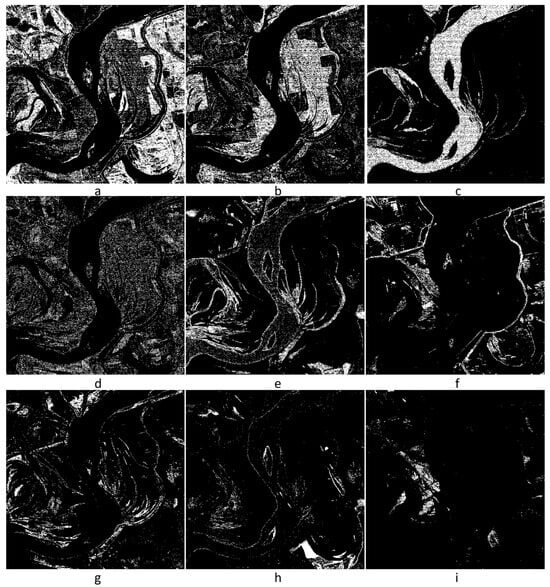 Figure 6 is the clustering result of the parameters in Table 2. It can be seen that class 1 is plow land or meadow (Figure 6a), class 2 is beach (Figure 6b), class 3 is river channel (Figure 6c), class 6 is dyke (Figure 6f), and class 9 is the slope on the bank (Figure 6i). The clustering results maintain significant signals and efficiently embody the minor signs. If the data are divided into 18 classes by the K-means algorithm, one iteration, on average, uses 60 s, so this clustering method, according to the features on the spectral curves of remotely sensed objects, is more flexible on parameter choice and has a quicker clustering speed than the standard clustering algorithm (such as K-means).