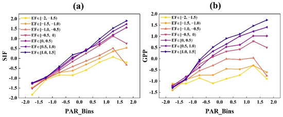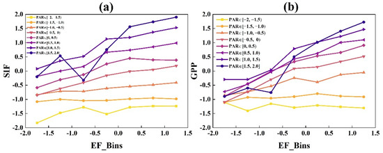 - Calculating the mean values of SIF within each PAR bin under different EF bins to characterize the responses of SIF to PAR under different EF intervals. The response of SIF to PAR under different EF intervals can be described as follows: