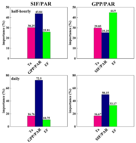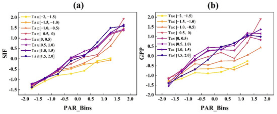 - GPP and SIF had similar light response trends, which both increased with increasing radiation, while the rates of increases in GPP and SIF exhibited divergence related to air temperature and water availability. When Ta and EF values were lower, SIF increased faster than GPP. With the increase in Ta and EF, the difference between the increase rates of GPP and SIF gradually reduced.