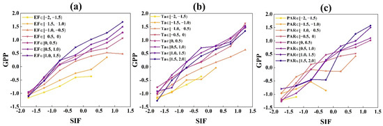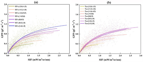 - The slope of the GPP–SIF relationship was mainly affected by Ta and EF, which increased with increasing EF and Ta.