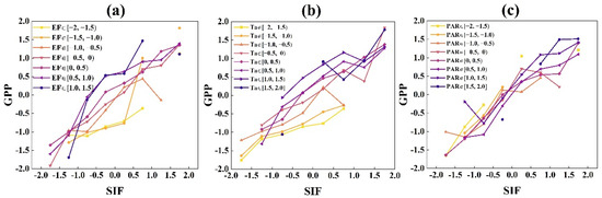 - The GPP–SIF relationship was decoupled when the environment was not suitable for vegetation growth, and the correlation between GPP and SIF was gradually improved with increasing Ta and EF.
