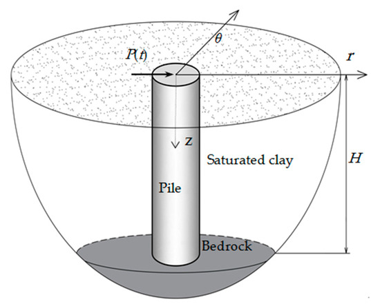 As shown in Figure 2, end-bearing piles are buried in a saturated clay foundation using a cylindrical coordinate system (r-θ-z) to build a pile–soil coupling system model. The bottom of the pile is a fixed end, with a pile length of H and a pile diameter of r0. The pile top is subjected to a sinusoidal horizontal vibration load P(t), which is defined as: