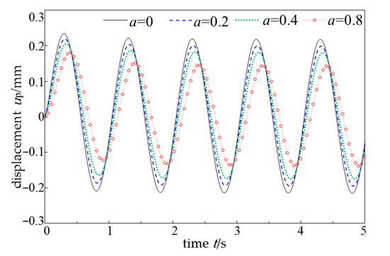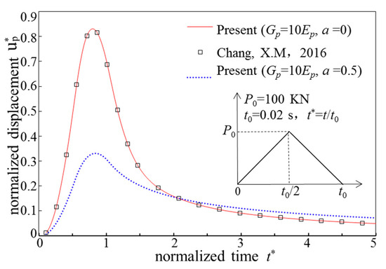 where t0 is the duration of the load action, and H() represents the Heaviside step function. Substitute Equation (39) into the system equation and calculate the time–domain solution of the pile top displacement through MATLAB(2018) programming. Figure 3 shows a comparison of the calculation results of the pile top displacement, and the results show that the degenerate solution in this paper is in good agreement with the literature solution (dimensionless displacement and dimensionless time in the figure). From Figure 3, it can also be seen that when considering the viscous rheological behavior of the soil (a = 0.5), the peak displacement of the pile top significantly decreases, and the deformation recovery rate after loading slows down, which is consistent with the conclusion obtained by Yin [30] through clay consolidation experiments.