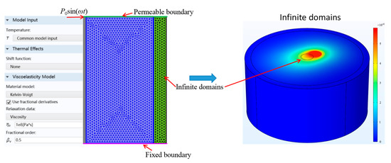 To further verify the reliability of the proposed method, a comparison was made between the proposed method and the finite element method for the horizontal vibration model of pile foundations in fractional-order saturated clay. Based on COMSOL(6.0)multi-physics field analysis software, a finite element model of soil was constructed under the solid mechanics porous media seepage module (as shown in Figure 4). The stress–strain relationship of the soil skeleton was described using the fractional order Kelvin Voigt constitutive model, and an infinite element domain was used at the radial boundary to make the soil model consistent with the theoretical model in this paper. Under the structural mechanics module, Timoshenko beams are used to simulate pile foundations, and the pile–soil interface is a coupled contact.
