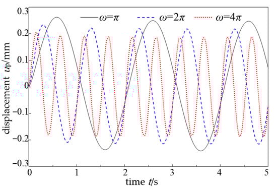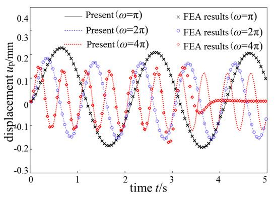 Figure 5 shows the comparison between the solution proposed in this paper and the finite element solution. The figure shows that the results of the two can be well matched when the load frequency is small, and when the load frequency is high (ω = 4π), the finite element calculation results show instability. Due to the use of the time integration method in finite element calculations, a very small integration step size is required to ensure calculation accuracy when the frequency is high. However, a small step size will result in very low calculation efficiency (when the step size is on the order of 10−4, the calculation time is about 3 h). Compared to other methods, the semi analytical method proposed in this paper has higher computational efficiency and stability.