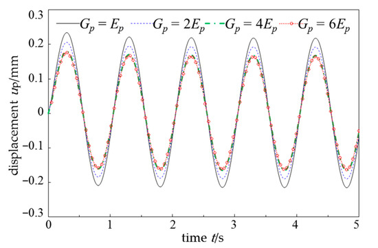 Based on Table 1, add viscosity coefficient η = 1 × 108 Pa·s, and use load function Equation (6) to calculate the horizontal vibration response of pile foundation in saturated clay foundation. Figure 6 shows the time-domain response of pile top displacement under different shear modulus Gp values. It can be seen from the figure that as the shear modulus of the pile foundation increases, the amplitude of pile top displacement decreases. When Gp increases to 6Ep, the displacement amplitude no longer changes, indicating that the Timoshenko beam has converged to the Euler beam. Figure 7 shows the vibration response of pile top displacement under different load frequencies. The figure shows that the larger the load frequency, the smaller the amplitude of pile top displacement. This result is consistent with basic vibration theory [31,32].