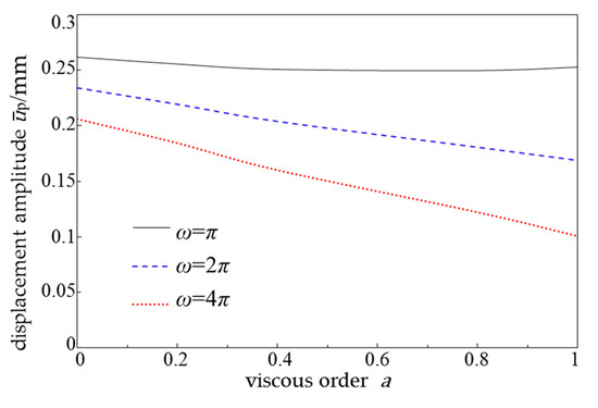 Figure 8 reflects the influence of soil viscosity order on the response of pile top displacement. The figure shows that the larger the viscosity order, the smaller the amplitude of pile top displacement, and the peak point of displacement moves backward on the time axis, reflecting the delayed effect of soil creep. According to the definition of the Kelvin rheological model, the higher the viscosity order, the stronger the rheological properties. Therefore, the results in Figure 6 indicate that the stronger the rheological properties of the soil, the smaller the displacement response amplitude of the pile foundation vibration and the more obvious the delay effect. Figure 9 further indicates that as the order of soil viscosity increases, the amplitude of pile top displacement decreases almost linearly, and the higher the load frequency, the greater the decreasing rate of displacement amplitude.