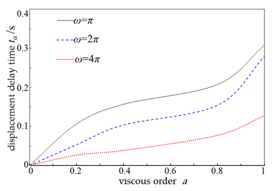 To further explore the parameter correlation of the displacement delay effect, this article defines delay time , where is the time corresponding to the first displacement peak and is the load period. Figure 10 shows the variation of delay time ta with the viscosity order. It can be seen from the figure that as the viscosity order increases, the delay time correspondingly increases. It is worth noting that the lower the load frequency, the more significant the change in delay time with the viscosity order.
