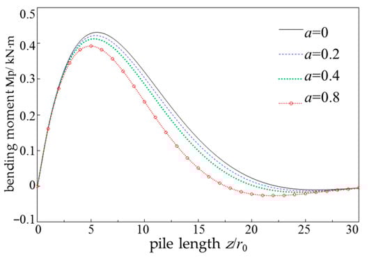 Vibration response of pile bending moment under different viscosity orders (ω = 2π, z = 5r0).