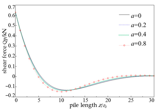 Vibration response of pile shear force under different viscosity orders (ω = 2π, z = 5r0).